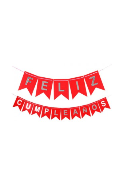 BANDERIN *FELIZ CUMPLEAÑOS* GLITTER ROJO, LETRAS PLATEADAS
