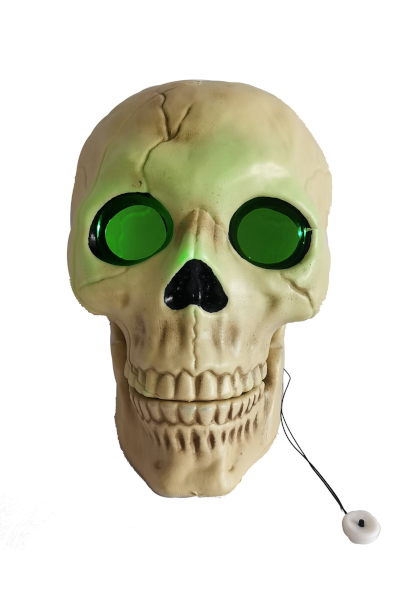 CRÁNEO CON OJOS FANTASMALES – 25x19x27cm, Pilas incluidas, EFECTO: luz verde
