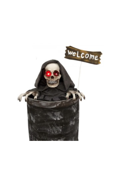 / FANTASMA *WELCOME* EN TACHO 81x46x42cm Luz, sonido y mueve la cabeza. 3AAA (no incluidas)