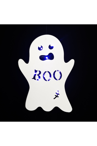 COLGANTE *FANTASMITA BOO* (PARA COLGAR) 41x30cm. Pilas Incluidas, 10 Luces led violetas