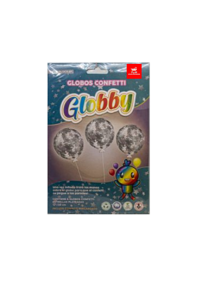 GLOBBY 12″ C/CONFETTI REDONDO ESTRELLAS PLATA – 6 u.
