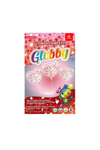 GLOBBY 12″ CORAZON c/CONFETTI CORAZON RJ Y BL – x 6 un.