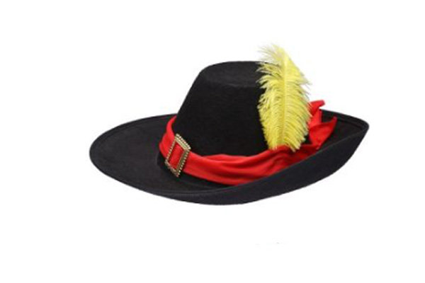 SOMBRERO MOSQUETERO NEGRO C/PLUMA AMARILLA