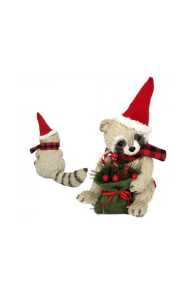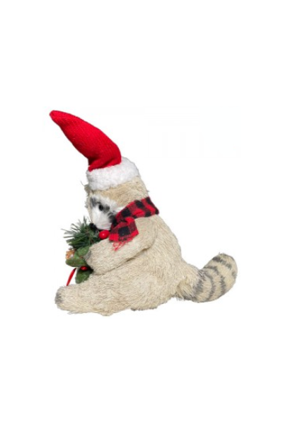 MAPACHE SENTADO CON BOLSA GORRO Y BUFANDA LEÑADOR 24X12,5X24