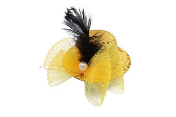 MINI GALERA DAMA AMARILLA C/ LENTEJUELAS, PERLA Y PLUMA NEGRA