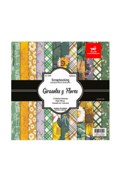 / PAPEL SCRAPBOOKING 160gr *GIRASOLES Y FLORES* 12hojas 15,2×15,2cm