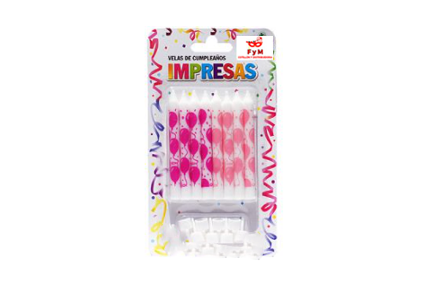 VELAS IMPRESAS BLANCAS GLOBOS ROSAS Y MAGENTAS – Blister x 8 u