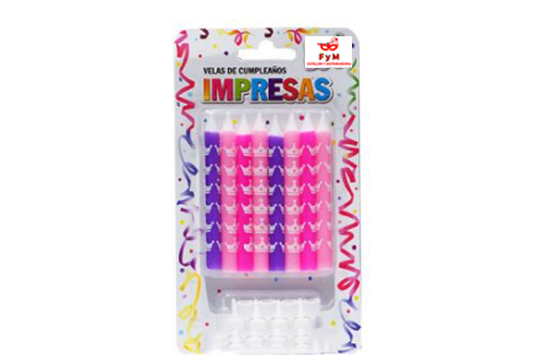 VELAS IMPRESAS VIOLETAS MAGENTAS Y ROSAS C/ CORONA – Bl x 8u